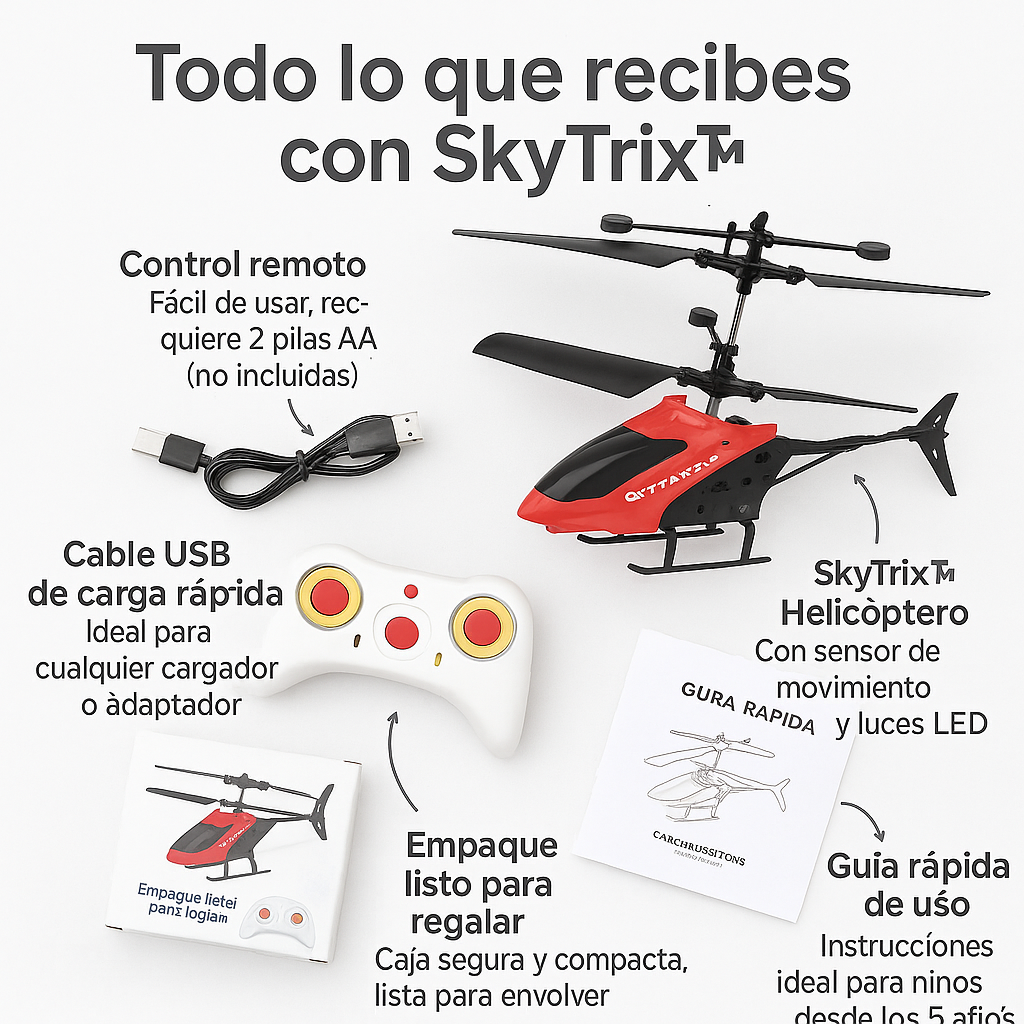 Recibirás: 1 helicóptero SkyTrix™, 1 control remoto (requiere 2 pilas AAA no incluidas), 1 cable USB de carga y una guía de uso rápido.